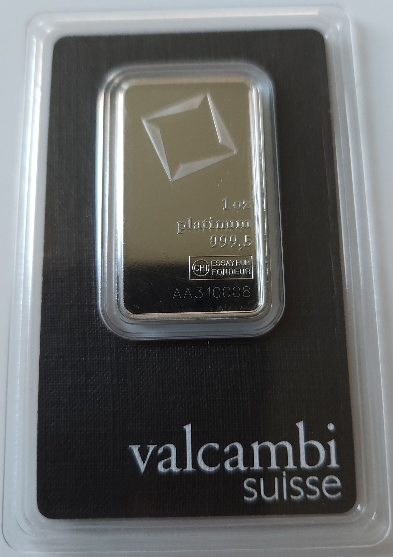 1 Troy Ounce Valcambi Suisse platinum bar (.9995 fine platinum), sealed in original assay card.